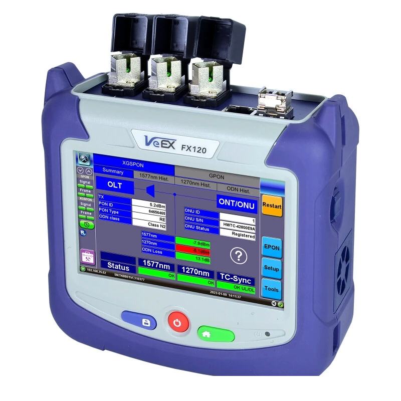 - The Next Generation FX120 is an all-in-one, advanced PON analyzer featuring a native RJ45 port and an SFP+ cage, supporting Layer 4+ testing. Ideal for service technicians tasked with service activation and resolving complaints, the FX120 monitors the activation process by displaying downstream/upstream power levels as well as OLT/ONT IDs, status, and TC-Sync. Certify QoE using optional Speed Test and V-PERF to check internet connectivity and speed up to 10 Gbps. An optional end-of-fiber detection feature allows technicians to check the length of drop cables before testing.